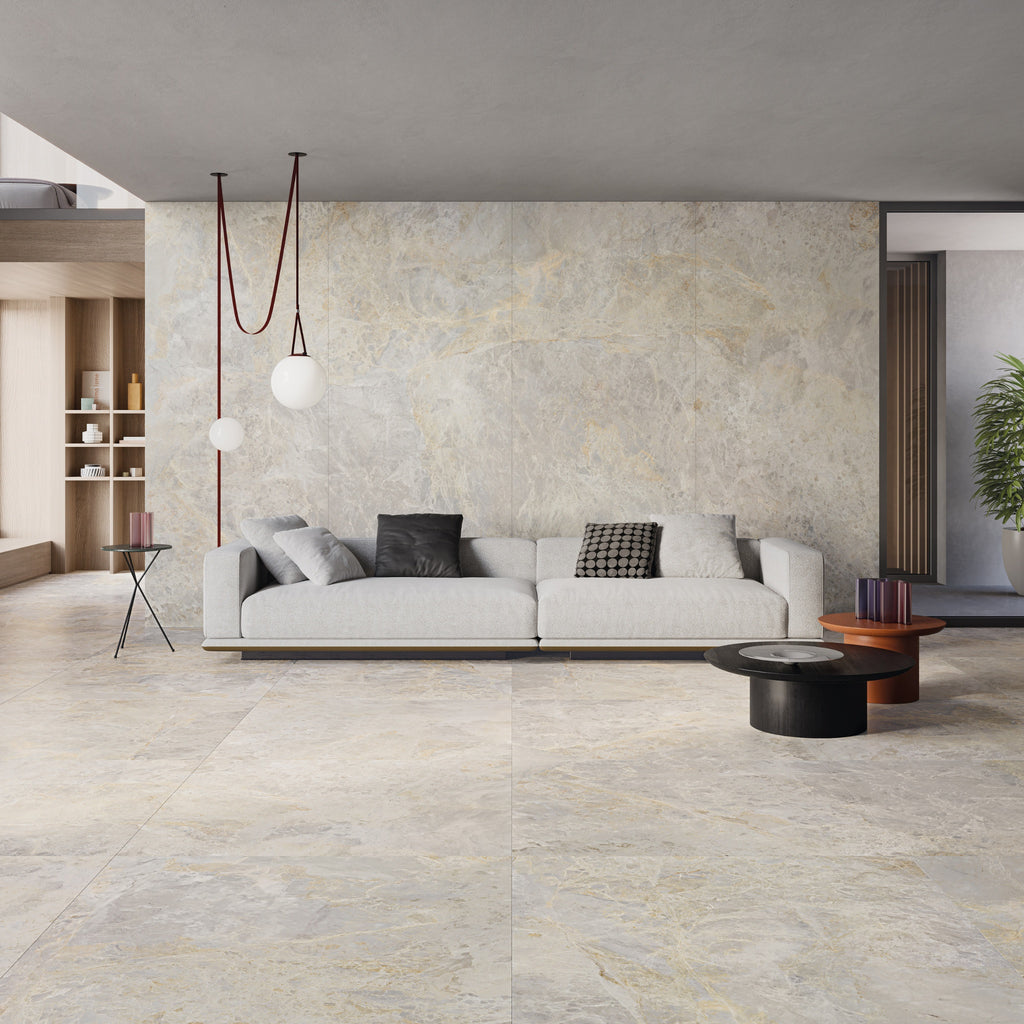 Versilia channels the character of marble from the Apuan Alps into durable porcelain, with a silk finish that brings out the fine veining and tonal depth of the stone. The surface is smooth with a gentle sheen—less reflective than gloss, more nuanced than matt—offering a practical, design-forward option for walls and floors. Available in three rectified formats, the finish supports clean lines and large-scale applications while staying true to the visual texture of natural stone.